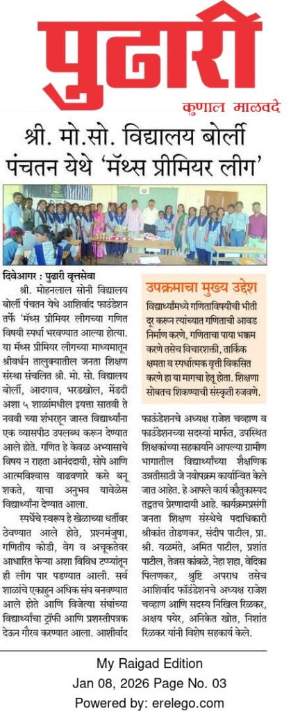 गणित शिक्षणात नवचैतन्य : श्री. मो. सो. विद्यालय बोर्ली पंचतन बोर्ली पंचतन येथे आशिर्वाद फाउंडेशनची मॅथ्स प्रीमियर लीग